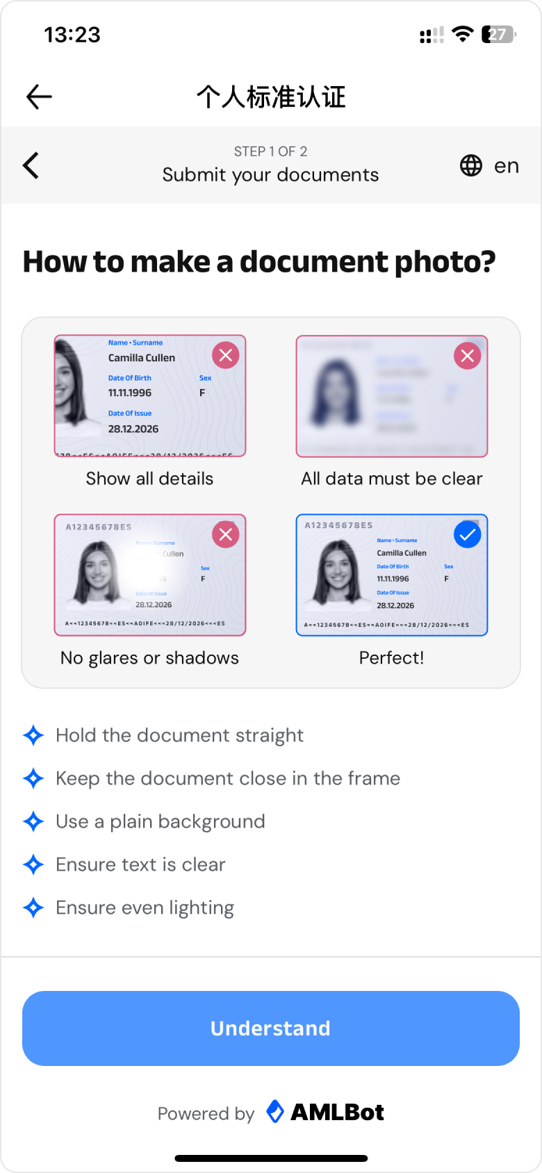 4. Follow the on-screen instructions to take clear photos of your ID. Make sure the entire document is within the frame, with all information visible and free from glare or obstruction. (If using a passport, only the personal information page is required.)